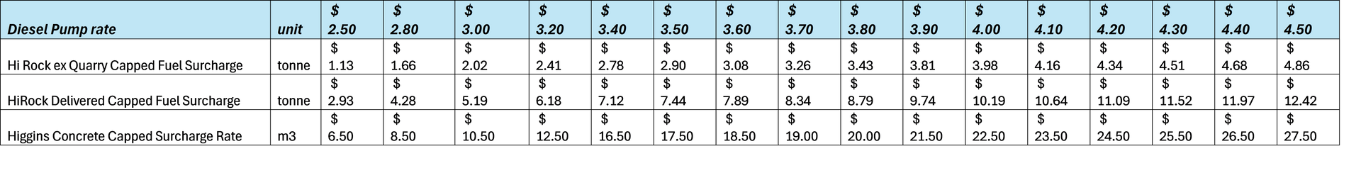 Effective from 20 April 2026 HiRock surcharges are as follows: Ex Quarry $3.26 + GST per T, Delivered $8.34 + GST per T.